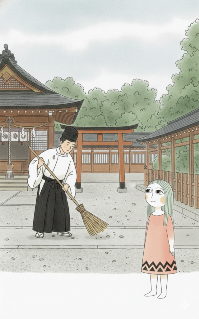 境内を竹ぼうきで、しゃっしゃっ…と掃いているTさんの姿が…。