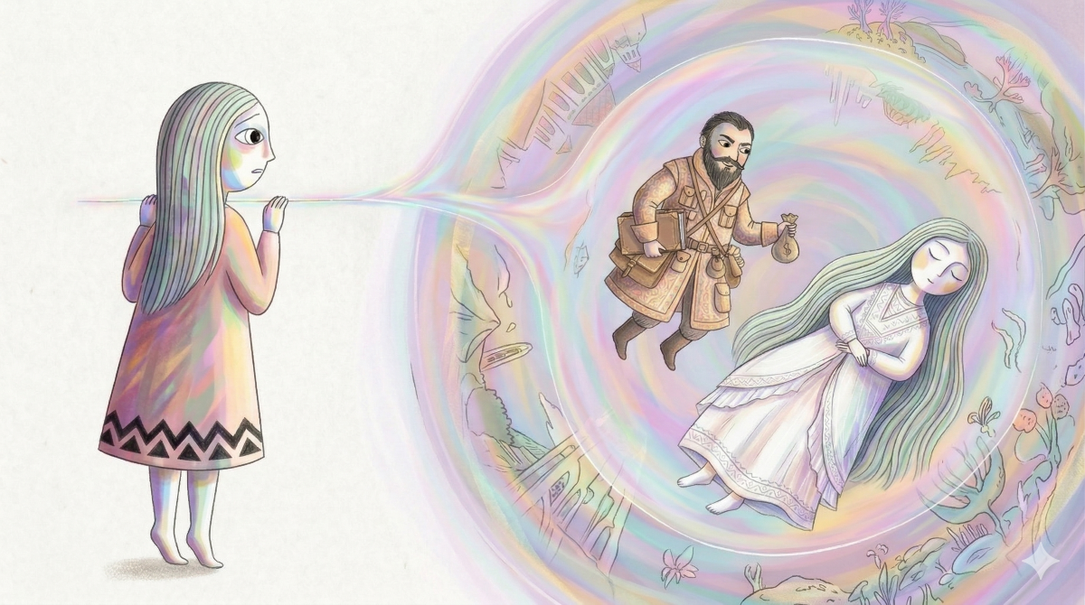 シャーマンが深い眠りに落ちたのを見計らって、男はそっと忍び込み、彼女の額に触れます。